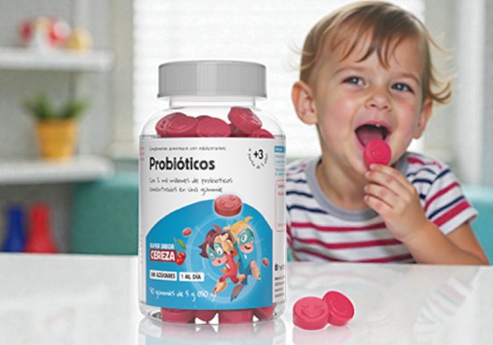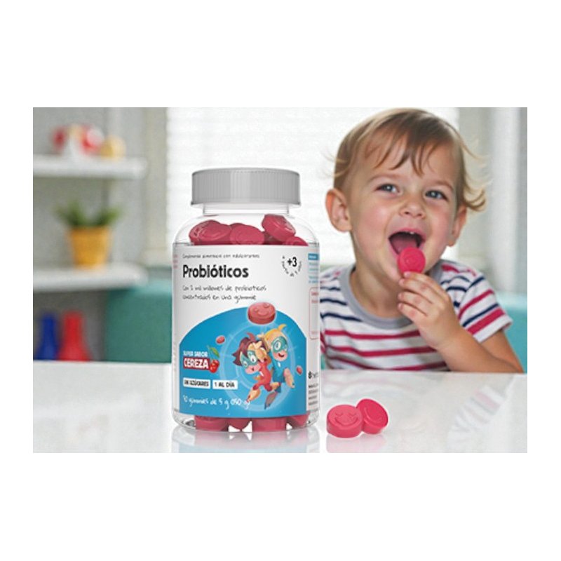 Complemento alimenticio, con sabor a cereza, formulado con 2 mil millones de probióticos concentrados en una única gummie, ideal para niños y niñas.