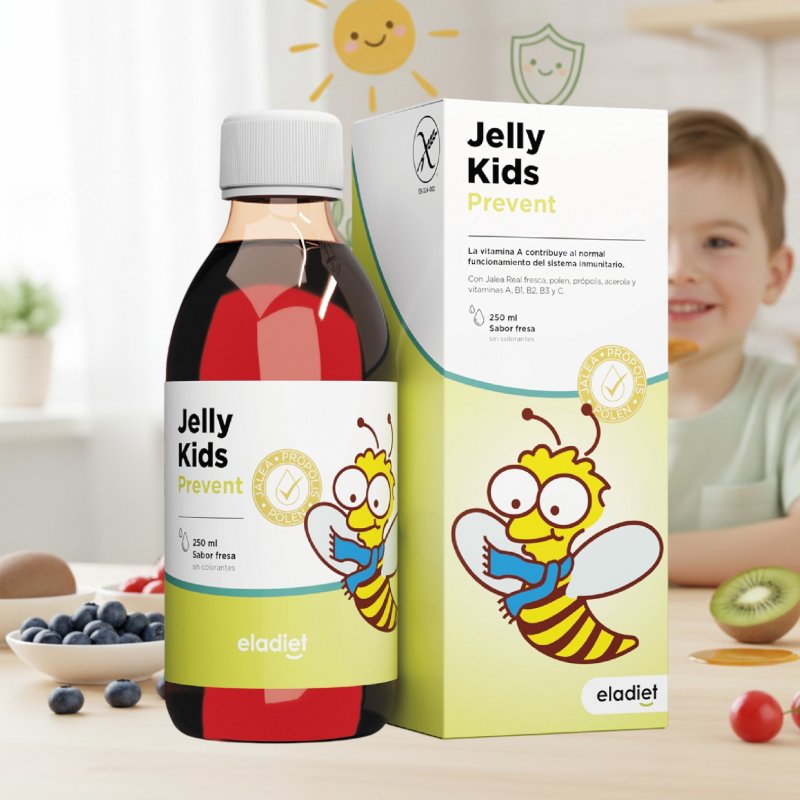 JellyKids Prevent contiene polen, jalea real fresca, própolis, acerola y la cantidad diaria recomendada de vitaminas A, B1, B2, B3 y C. La vitamina A contribuye al normal funcionamiento del sistema inmunitario. Las vitaminas C, B1, B2 y B3 contribuyen al normal metabolismo energético.